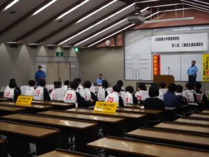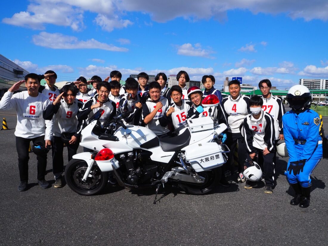 大阪府交通機動隊(白バイ)にも来て頂き、デモ走行を行って頂きました。安全運転を一番意識しながら運転技術も高い白バイの方のデモ走行には、参加生徒や教員も見入ってしまい、とてもかっこよかったです。その後、全員で記念撮影を行い、講習がスタートしました。