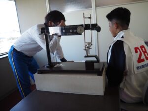 まずは、全員でタイヤやブレーキの確認などバイクの安全点検の確認を行い、安全に乗車するためのポイントを教えて頂きました。その後は、校内講習と実技講習に分かれて、各講習を受講しました。校内講習は、シミュレーター、反射時間、視角など自分の洞察力の確認を行いました。