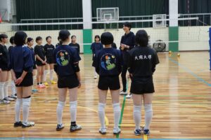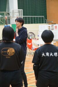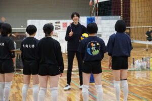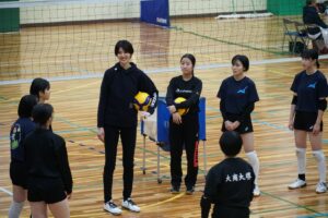 「日々の練習の中で、自分たちではなかなか気づけなかったこと、また気づいていてもどう改善するかが分からない部分を的確にご指摘していただきました。技術指導だけではなく、チームとして上手くなるにはどうするべきか、チームメートを思いやること、コミュニケーションを取ることの大切さも教えていただきました。指導をしていただいている時は終始笑顔で接してくださいましたが、サーブやトスをする瞬間には「選手」としての目つきになっていました。このことから、心の切り替えの大切さも学ぶことができました。」
