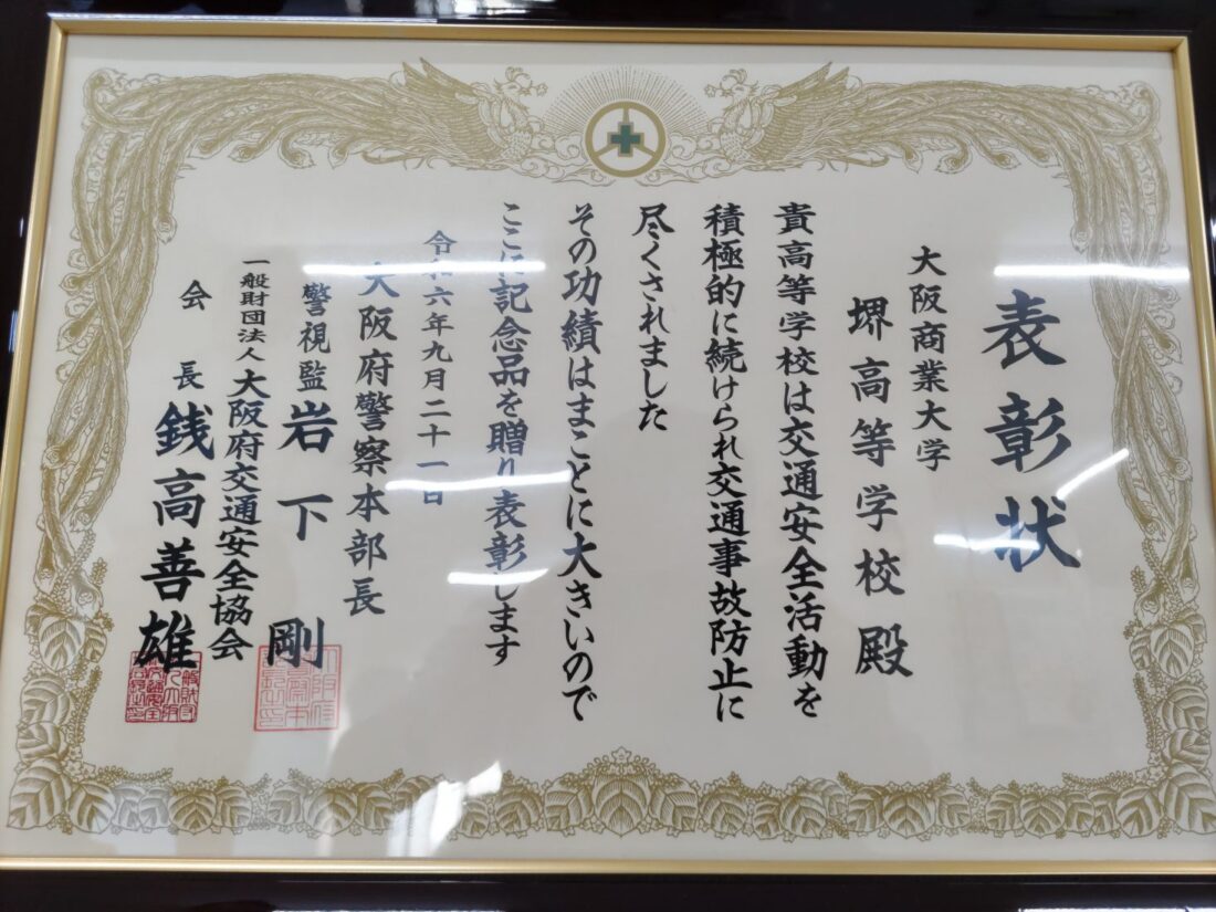 その中で、本校はR2年度以来、4年ぶりに「交通安全活動」における学校部門において表彰されました。表彰されたことを名誉に思い、継続して生徒たちの交通安全指導により一層取り組んでいきます。この度は、西・中警察署及び交通安全協会の皆様、ありがとうございました。