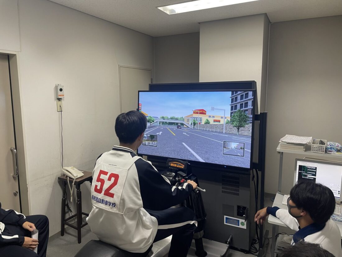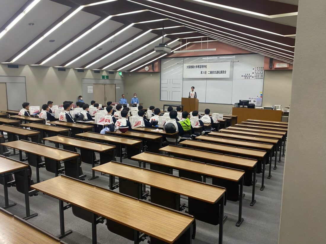 今年は、元白バイ隊である西堺警察署交通課松原さんにデモ走行を行って頂きました。安全運転を一番意識しながら重たいバイクをコントロールする技術を教えて頂き、参加生徒や教員も見入ってしまい、とてもかっこよかったです。その後、全員で記念撮影を行い、講習がスタートしました。校内講習は、シミュレーター実習、反射時間の確認、視角の確認など自分の洞察力の確認を行いました。