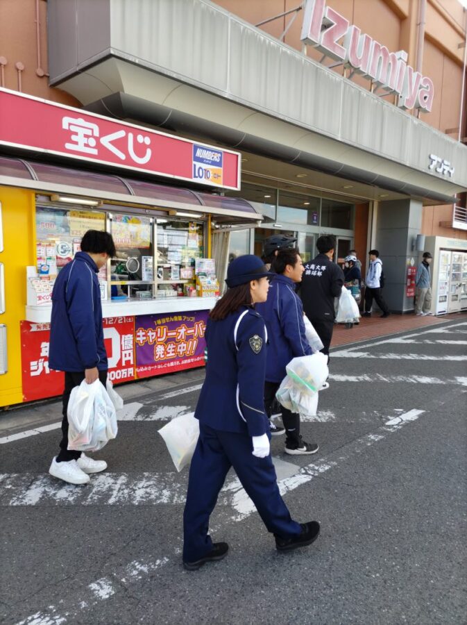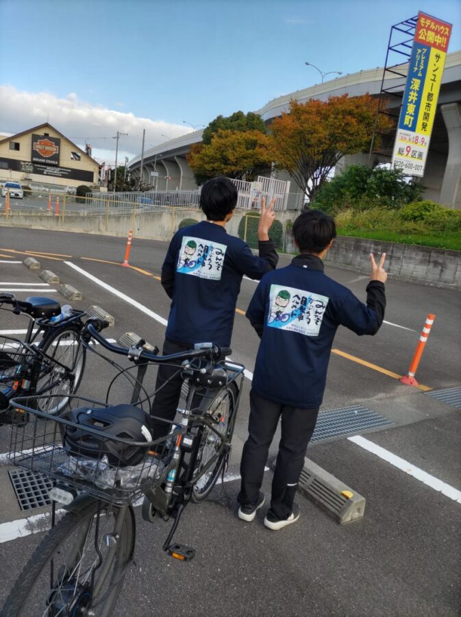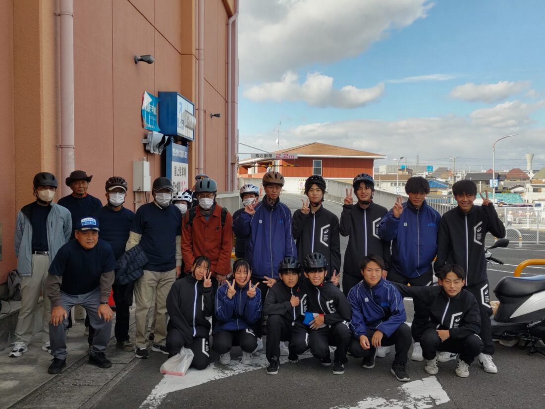 11月23日(土)、イズミヤ泉北店にて、中堺警察署及び中堺交通安全協会主催の自転車マナーアップ強化キャンペーンがありました。本校を代表して、男子バレーボール部の1年生11名が参加をし、自転車乗車時におけるヘルメット着用や自転車マナーを守ってもらうようチラシ等を警察の方や中堺ヘルメットかぶり隊の皆様と一緒に配付しました。また、交通機動隊(白バイ)がきたり、パトカーやハーレーの展示があったり、キッチンカーもきて、大変盛り上がっていました。
