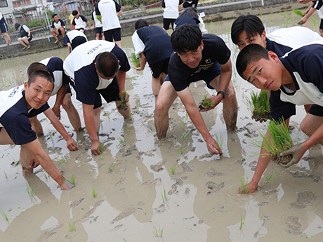 勤労学習の開始は昭和56年にさかのぼります。体育館や運動場の整備とともに演習農園が設けられました。880坪を超える演習農園では、土づくりから田植え、収穫まですべて生徒たちの手で行います。生徒たちにとっては土に触れ、農作物を育てる勤労の意義や厳しさ、収穫の喜びを感じる機会となっています。