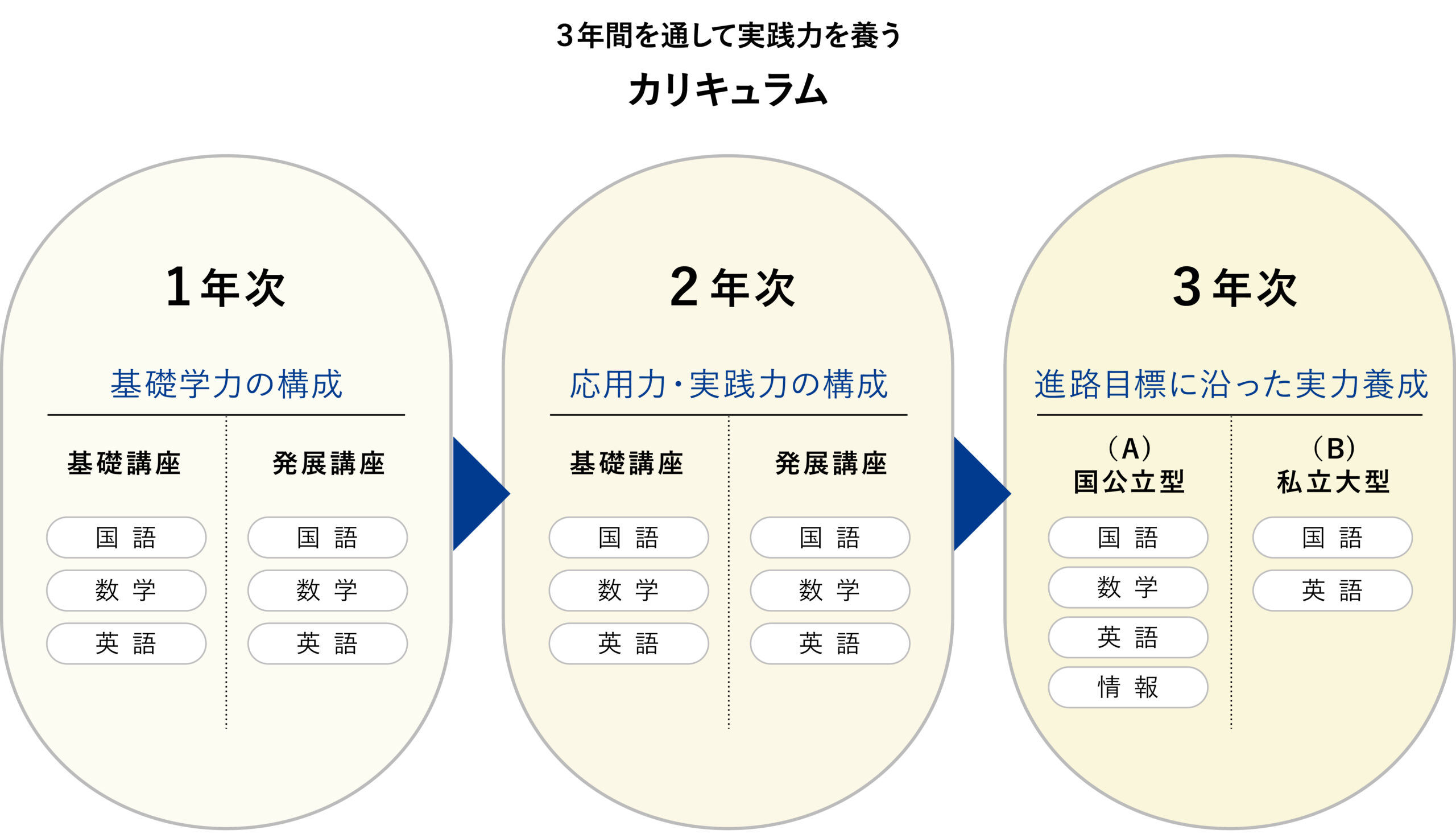 3年間を通じてステップアップできる学習環境を整えています。1年次には各教科の基礎学力の定着をはかり、2年次には応用力・発展力を育て、3年次には進路目標に合わせた実力を養成します。